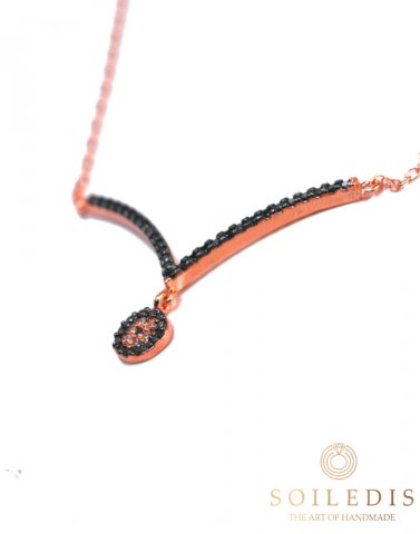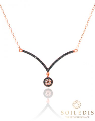 Κολιέ γυναικείο από ασήμι σε ροζ χρύσωμα, με σχέδιο V διακοσμημένο με μαύρα Ζιργκόν πάνω σε μαύρο επιπλατίνωμα και στο κέντρο ματάκι με Ζιργκόν.
