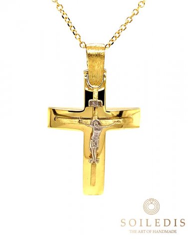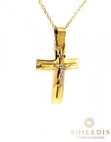 Αντρικός σταυρός από κίτρινο και λευκό χρυσό, 14 καρατιών σε γυαλιστερό και ματ φινίρισμα.