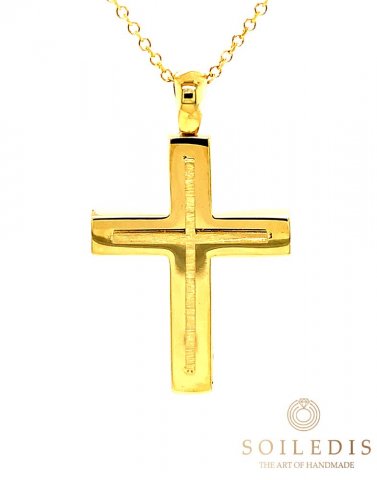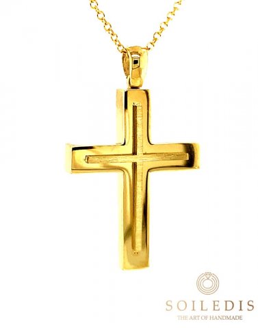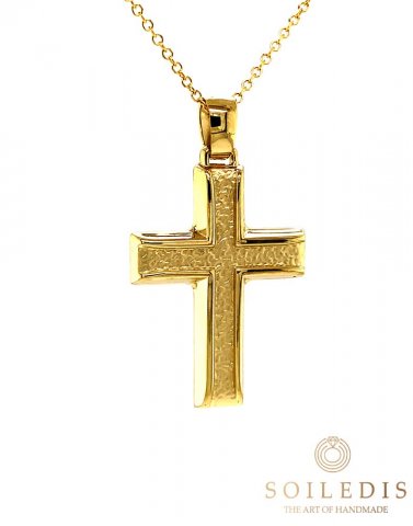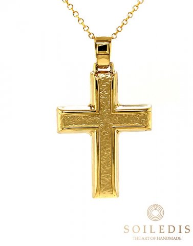 Αντρικός σταυρός από κίτρινο χρυσό, 14 καρατιών σε γυαλιστερό φινίρισμα και λεπτομέρεια από ματ φινίρισμα.