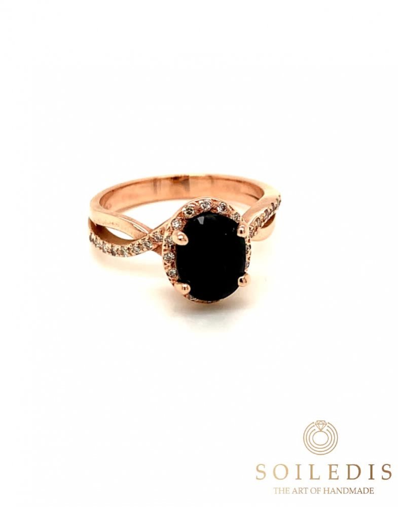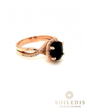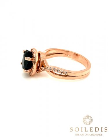 Μονόπετρο δαχτυλίδι από ροζ χρυσό, χειροποίητο. Στο κέντρο του έχει μπλε Ζαφείρι βάρους 2,24ct καρφωμένο στο χέρι πάνω σε τέσσερα δόντια και η γάμπα του είναι διακοσμημένη με λευκά Διαμάντια συνολικού βάρους 0,16ct.