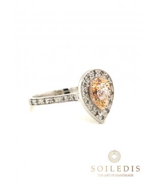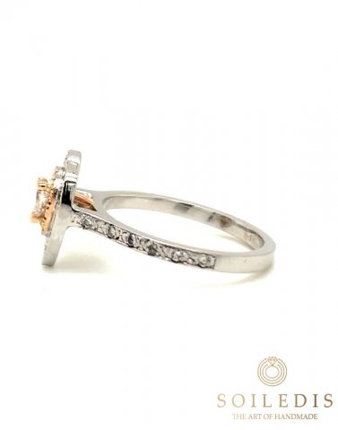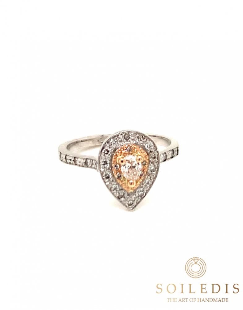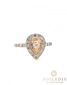 Δαχτυλίδι ροζέτα δάκρυ από λευκό και ροζ χρυσό. Στο κέντρο έχει λευκό Διαμάντι βάρους 0,31ct καρφωμένο πάνω σε τέσσερα δόντια από ροζ χρυσό. Περιμετρικά υπάρχουν δύο επίπεδα, το πρώτο από ροζ χρυσό και το δεύτερό από λευκό χρυσό, διακοσμημένα με μικρότερα λευκά Διαμάντια συνολικού βάρους 0,19ct.