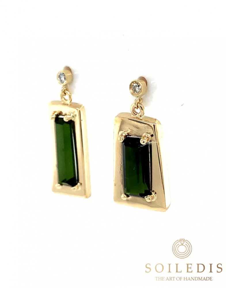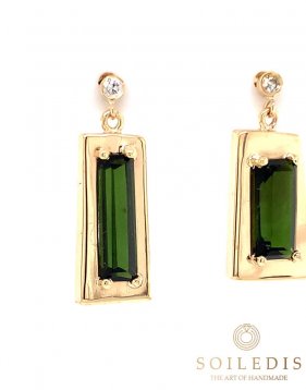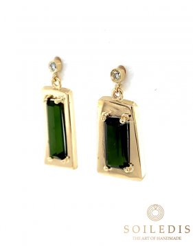 Σκουλαρίκια από κίτρινο χρυσό, σε τετράγωνο σχήμα, κρεμαστά με πράσινη τουρμαλίνα και λευκό διαμάντι στην κορυφή.