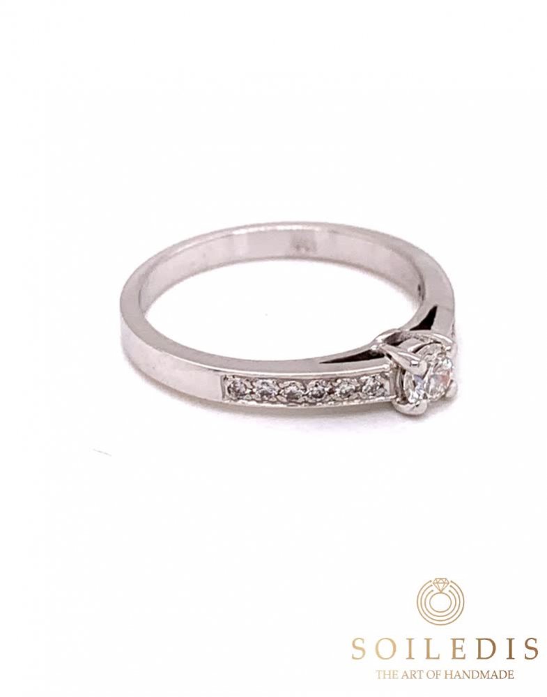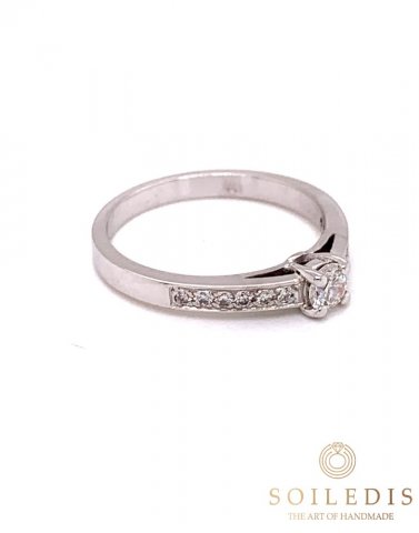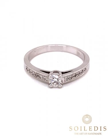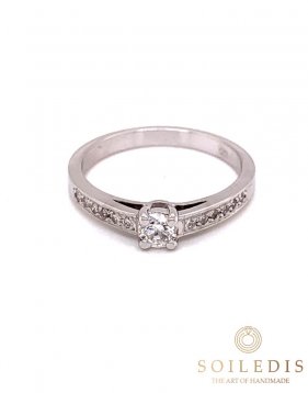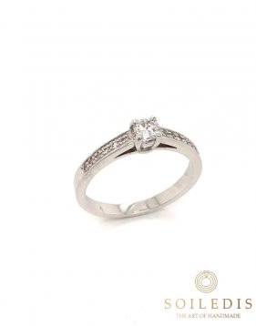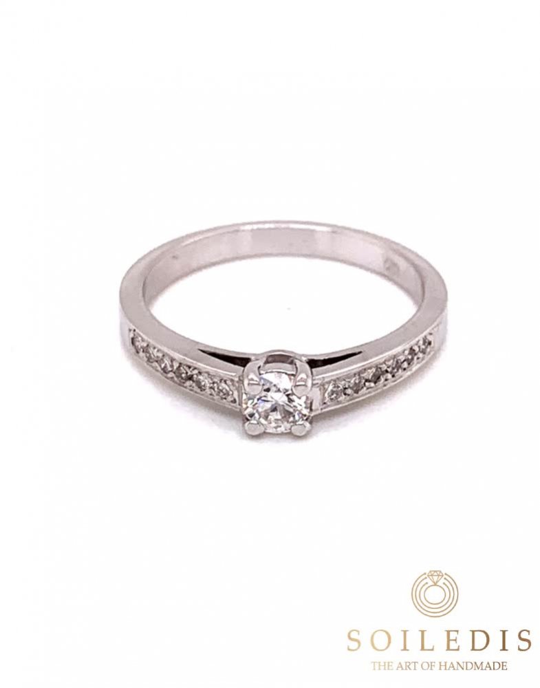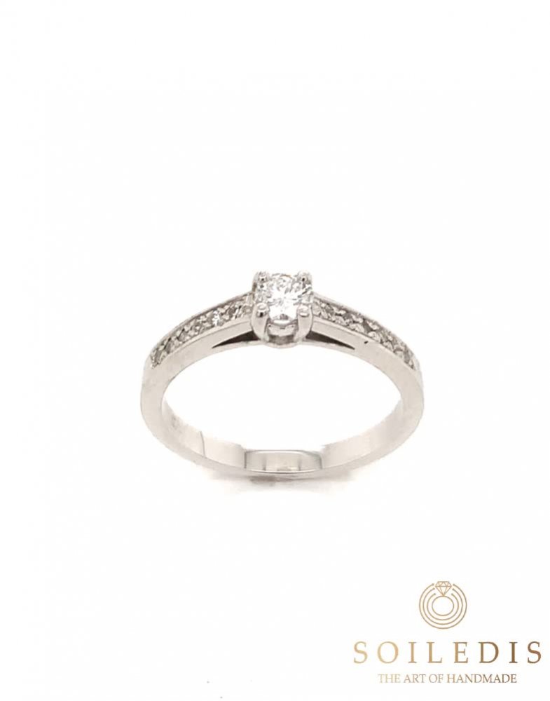 Μονόπετρο δαχτυλίδι από λευκό χρυσό κ18,  με λευκό Διαμάντι στο κεντρο βάρους 0,20ct και γάμπα διακοσμημένη Διαμάντια συνολικού βάρους 0,10ct.