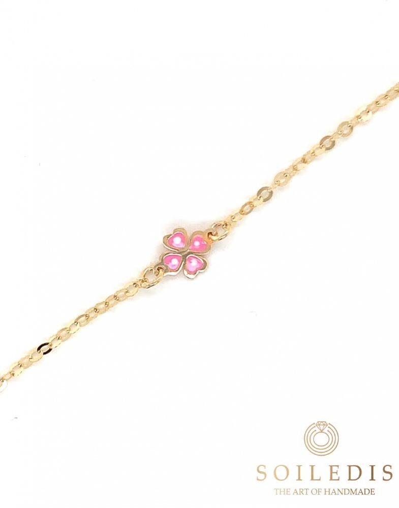 Βραχιόλι παιδικό από κίτρινο χρυσό με ροζ λουλουδάκια.