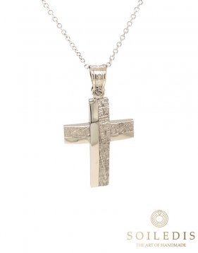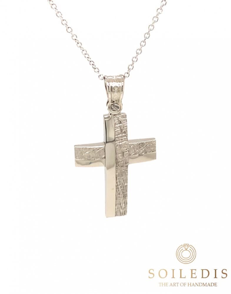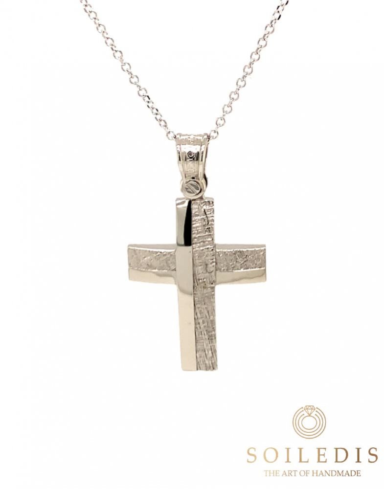 Αντρικός σταυρός σε μοντέρνα γραμμή από λευκό χρυσό, 14 καρατίων, με γυαλιστερό και σφυρήλατο φινίρισμα.