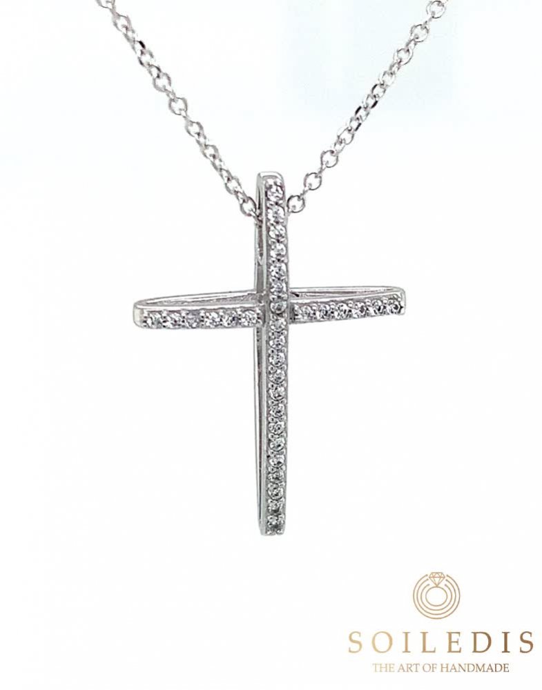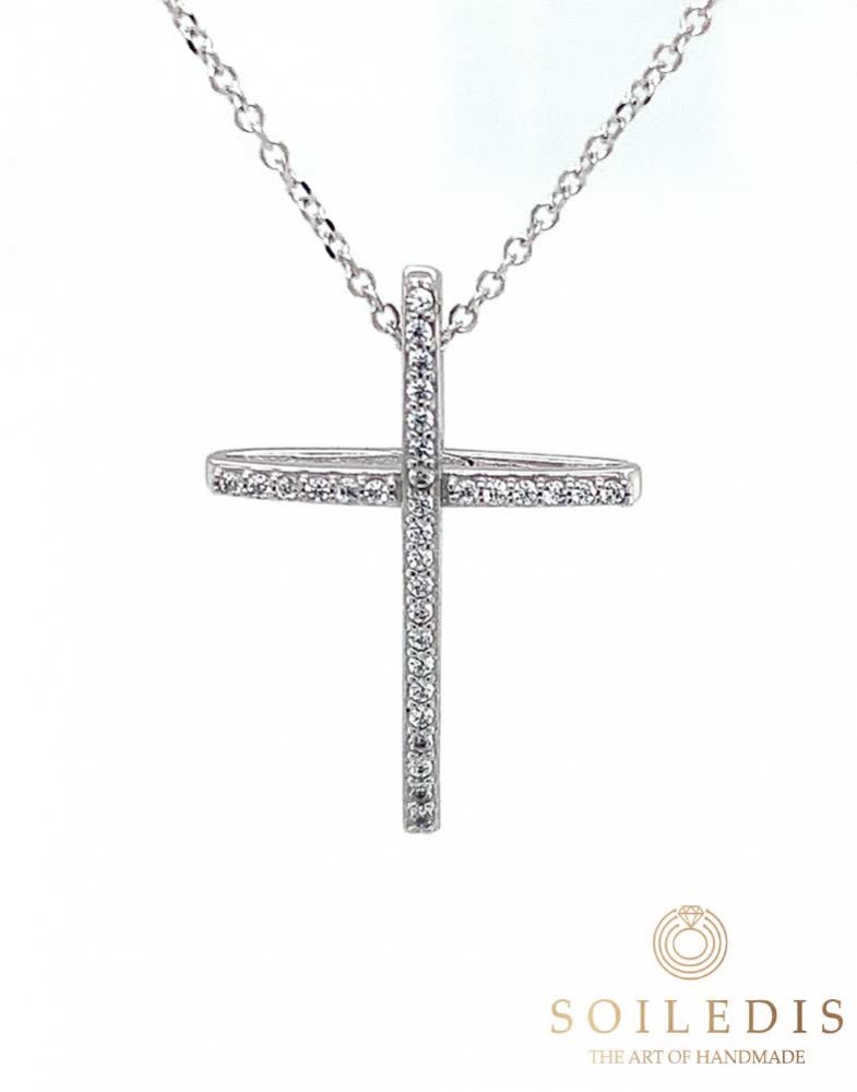 Γυναικείος σταυρός από λευκό χρυσό, 14 καρατιών, σε μοντέρνα γραμμή με γυαλιστερό φινίρισμα λευκά Ζιργκόν.