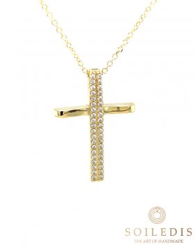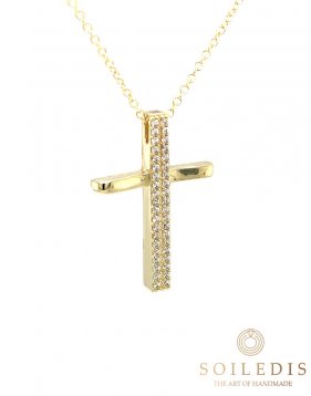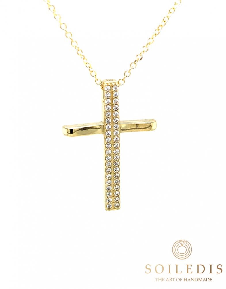 Γυναικείος σταυρός από κίτρινο χρυσό, 14 καρατιών, σε μοντέρνα γραμμή με γυαλιστερό φινίρισμα λευκά Ζιργκόν .